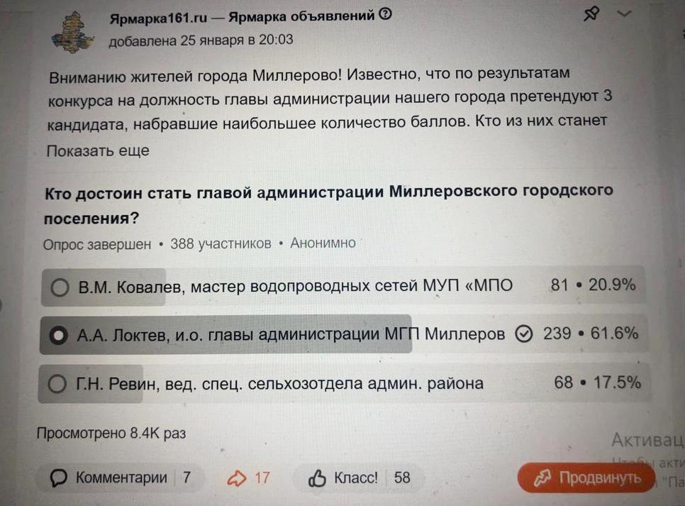 Жителям города Миллерово было предложено выбрать одного из 3 кандидатов на должность главы администрации города, набравших наибольшее количество баллов на конкурсе на замещение должности главы администрации Миллеровского городского поселения от 19.01.24 г.