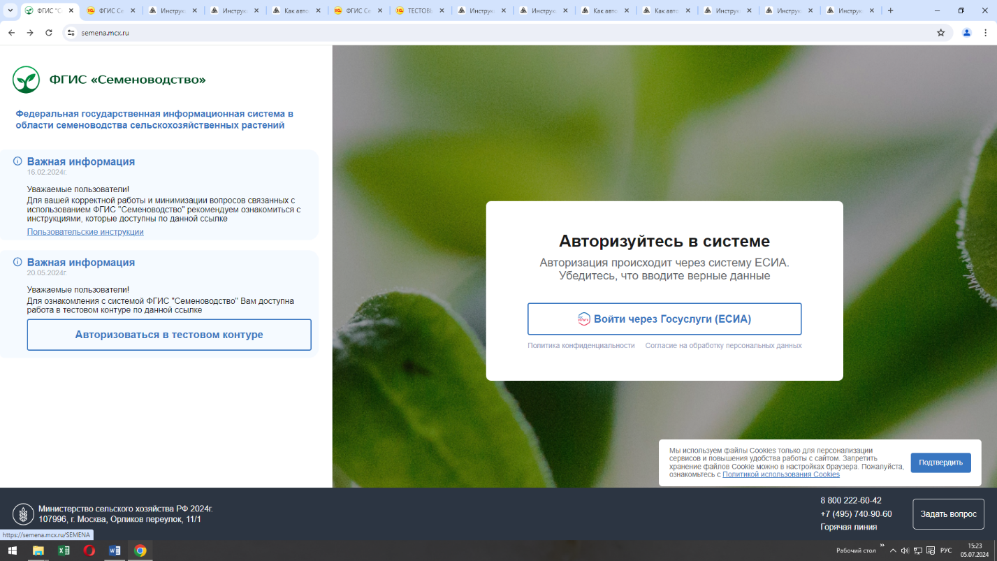 Сельхозтоваропроизводитель заходит на сайт https://semena.mcx.ru/ Попадает на рабочий стол ФГИС Семеноводство Слева расположено окошко авторизоваться в тестовом контуре. Пользователь должен иметь учётную запись на ГУ Войти, как представитель предприятия (необходимо иметь электронную цифровую подпись) Автоматически попадаете в личный кабинет организации на сайте ФГИС СеменоводствоПоследние новости