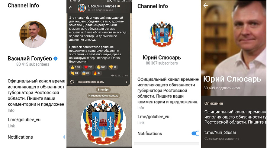 Сначала в ТГ-канале Василия Голубева появилось фото Юрия Слюсаря, но имя не поменялось. Затем вместо фото Слюсаря появился герб Ростовской области. На третьем шаге наконец изменилось название ТГ-канала и регалии владельца. Ещё через несколько минут трансфер завершился: в губернаторском ТГ-канале появилась фотография нового владельца.