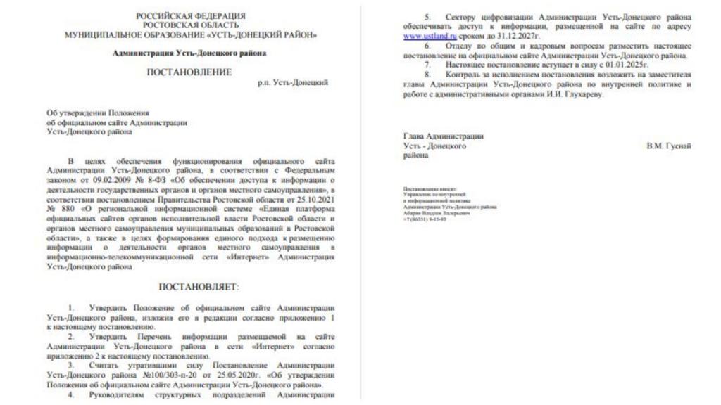 Согласно Постановлению Администрации Усть-Донецкого района № 100/1007-п-24 от 13 декабря 2024 года, с 1 января 2025 года действующий сайт располагается по следующему адресу: https://ustland.donland.ru.