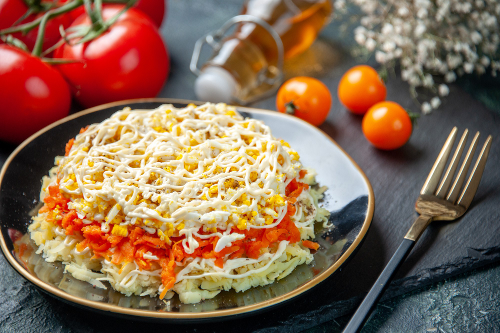 Вымытую и очищенную морковь натираем на мелкой терке, добавляем 2 ст. л. «правильного» майонеза, хорошенько всё перемешиваем и делим на две равные части.